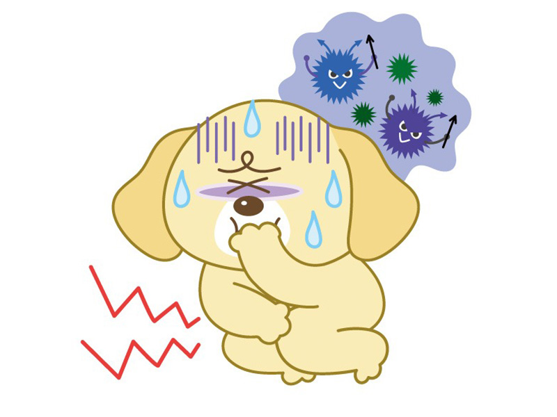 乾いた咳、発熱、鼻水などが認められます。悪化すると、湿性の咳が出たり、元気食欲の低下、呼吸困難などが認められることもあります。