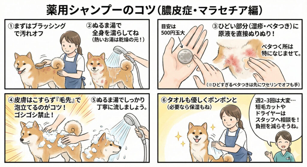 ご自宅での薬用シャンプーは、多いと週に2−3回お願いすることがあります。