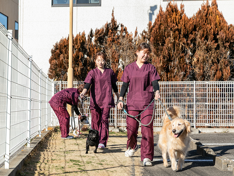 また、獣医師が常駐する動物病院併設のため、万が一体調を崩した際にもすぐに対応できる体制を整えております。定期的な健康チェックや食事の管理も行い、ペットの健康維持をサポートします。普段食べ慣れているフードをお持ちください。その他ご希望があれば事前にお知らせください。旅行や出張、急な外出時にも、安心してペットをお預けいただけます。