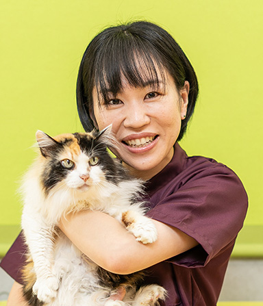 言葉の通じない動物の訴えや飼い主さまの不安や悩みを、細かく温かく受け止め対応できる看護師でありたいと思っています。 また、動物と飼い主さまと獣医師がストレスなく治療に臨めるよう、良い橋渡しの役目を目指して日々努めています。 どんな些細なことでも、獣医師には少し話しにくいことでも、なんでもお伝えください。